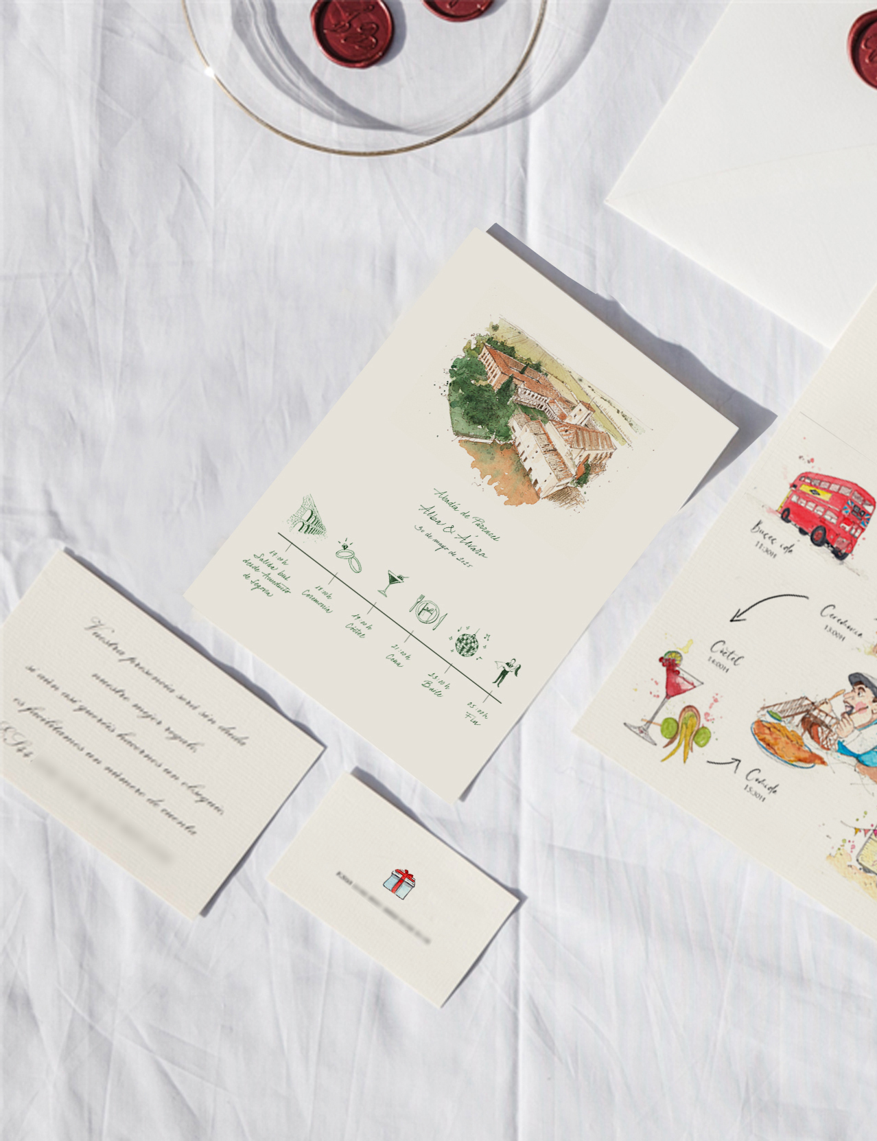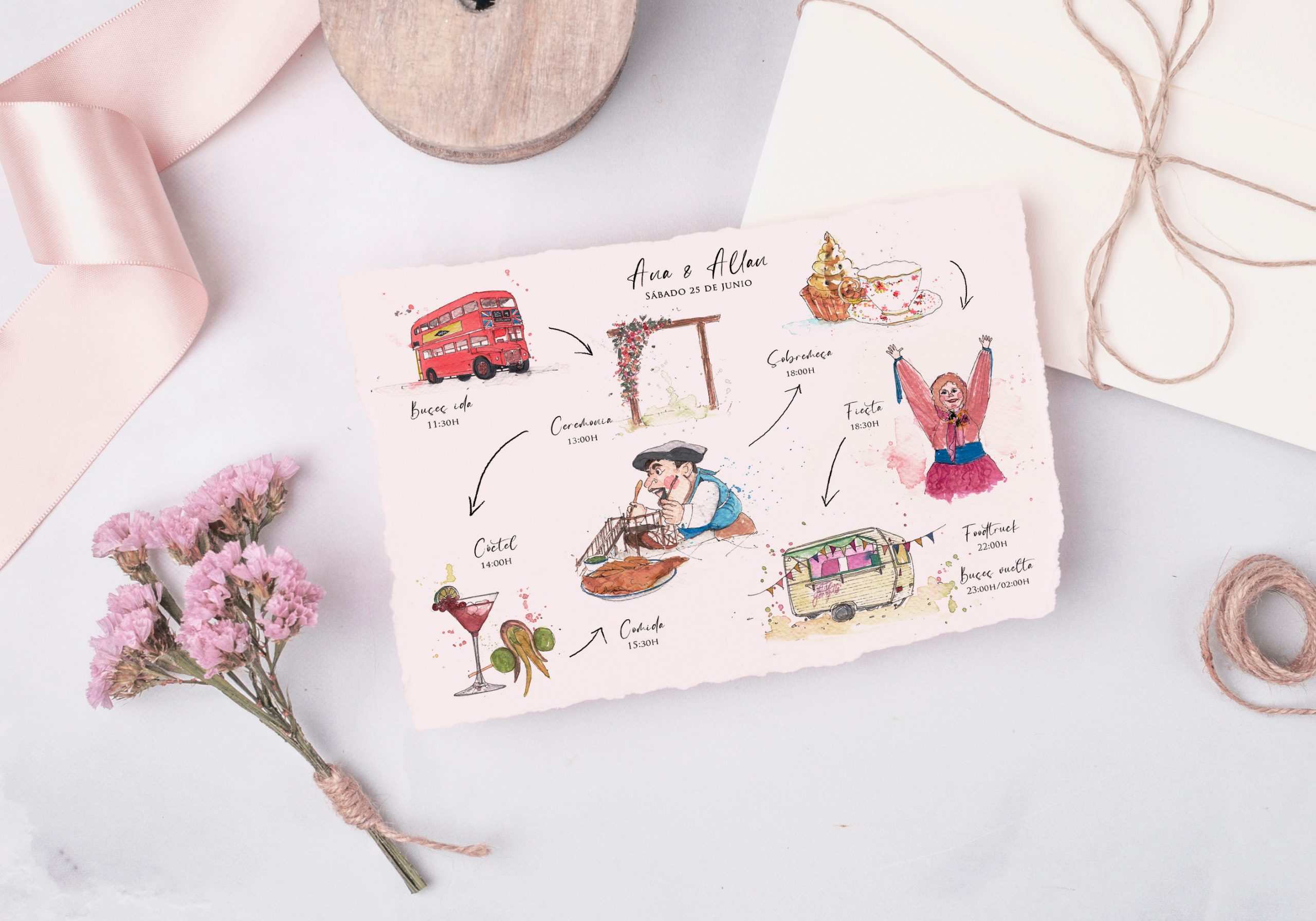 Una de las piezas más demandadas y visualmente atractivas es el timeline para invitaciones de boda. A través de pequeñas ilustraciones y una caligrafía cuidada, narro los hitos de tu día: desde la ceremonia y el cóctel hasta el banquete y el baile. Es la herramienta perfecta para que tus invitados se sientan guiados y sepan qué esperar en cada momento.