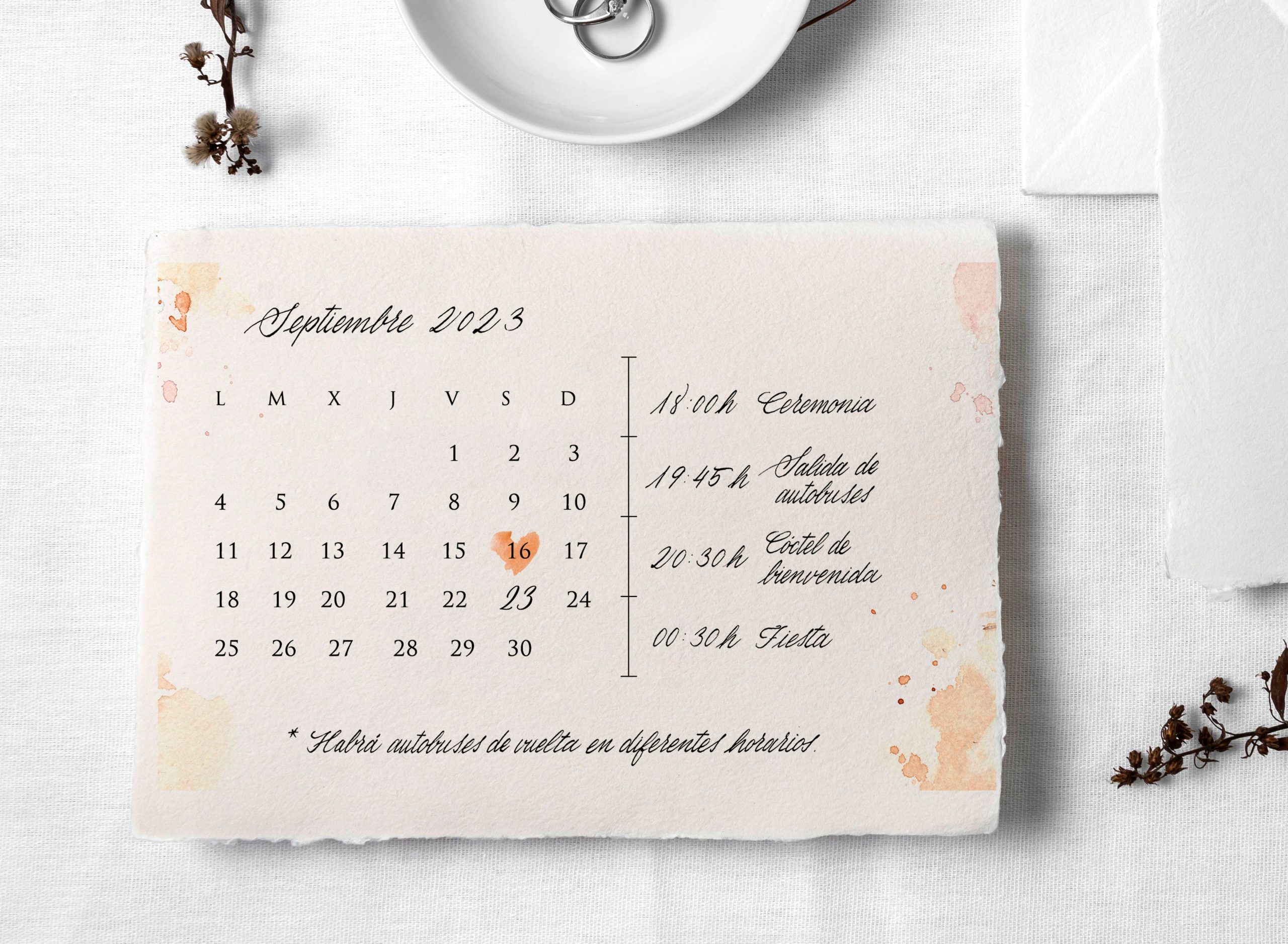Creo estos cronogramas utilizando iconos personalizados o delicadas manchas de acuarela que marcan el ritmo del evento. Mi formación como Arquitecta de Interiores me permite estructurar el espacio de la tarjeta de forma equilibrada, asegurando que la jerarquía visual sea impecable. Un time line bien diseñado no solo ayuda a la organización, sino que se convierte en un recuerdo precioso que muchos guardarán con cariño.